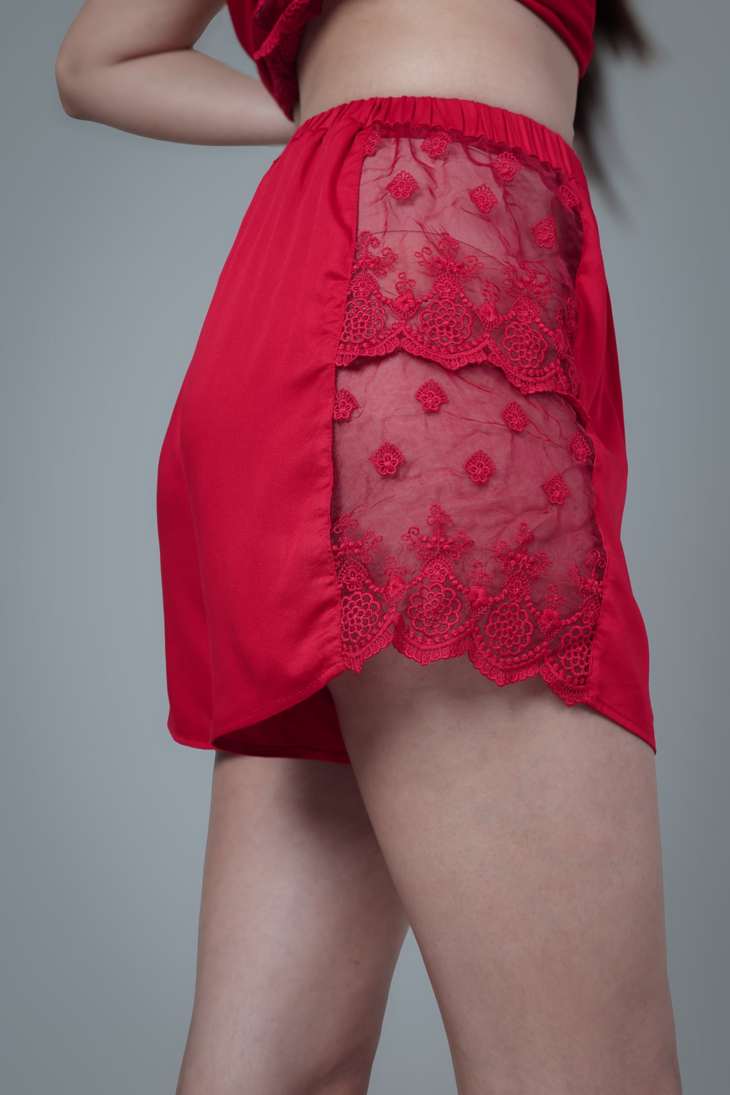 Softly seductive and effortlessly elegant, the Luné Set blends fluid comfort with romantic charm.The cowl neck camisole drapes beautifully, offering an elevated silhouette that feels both relaxed and refined.Paired with lace-panelled shorts that whisper femininity, this set is your go-to for graceful lounging or winding down in style.