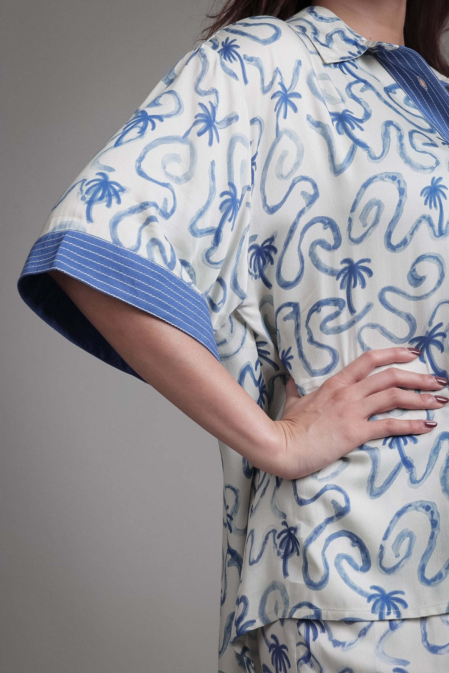 A relaxed-fit, short-sleeve shirt tailored in soft viscose satin. The design features a shoulder yoke at the back, finished with a sharp box pleat for volume and movement.A contrast cuff band in deep blue, accentuated with top running stitch, adds structure to the fluid silhouette.Designed with a curved hem and crisp collar, this piece effortlessly balances comfort and style.
